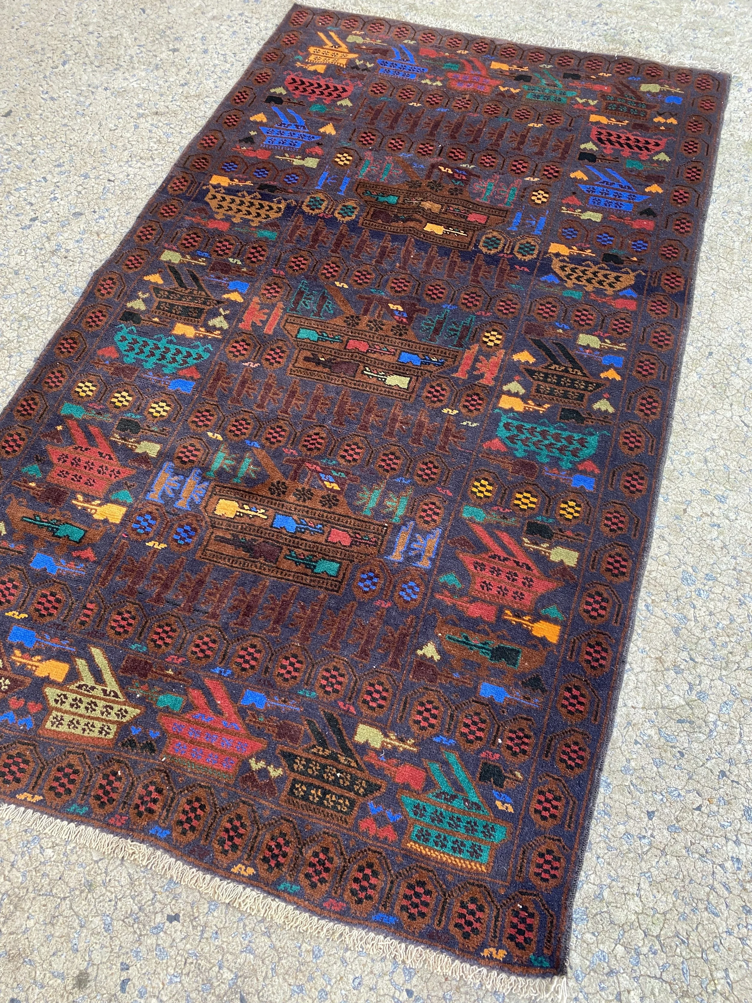Vintage Afghan Balouch War Tank Rug. Beautifully hand knotted with vegetable dyes. Wool. Very good condition. Condition visible in photos.