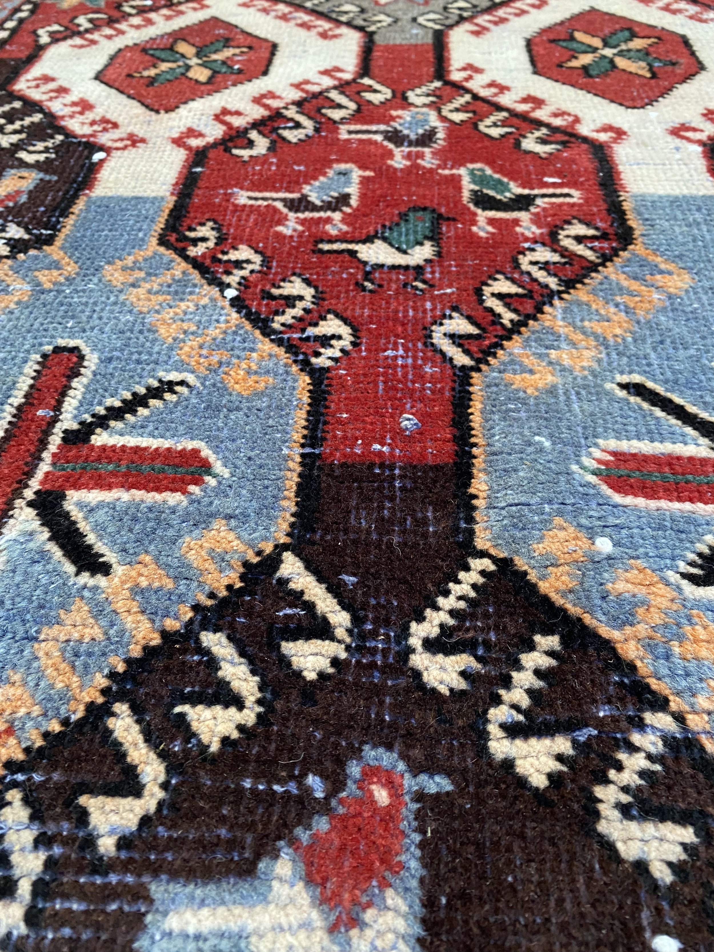 Antique Karache Persian Runner. Beautifully hand woven in the 1930s with vegetable dyes. Wool. No rips or tears. Vegetable dyes faded in some areas. Repaired fringe. Thinning and wear shown throughout. Condition visible in photos.